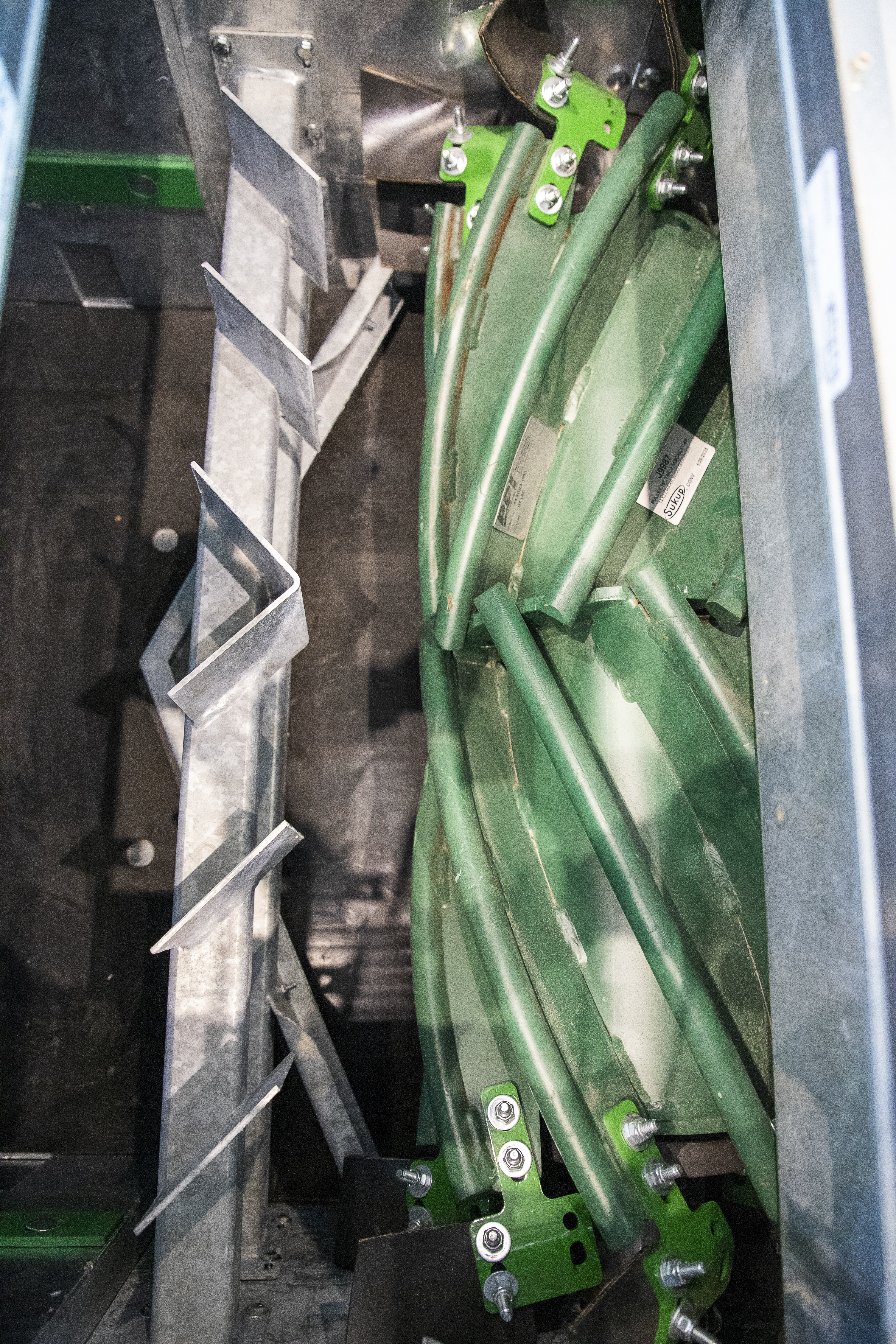 A ½" antistatic UHMW bottom liner and tongue-and-groove floating liner attachment promote smooth belt movement, reduced friction, and minimized static—key advantages for reliable grain conveying. The conveyor’s 5' spaced conical idlers, spherical roller bearings, and 1¼" stub shaft idler connection support consistent belt tracking and efficient grain transfer across the system.